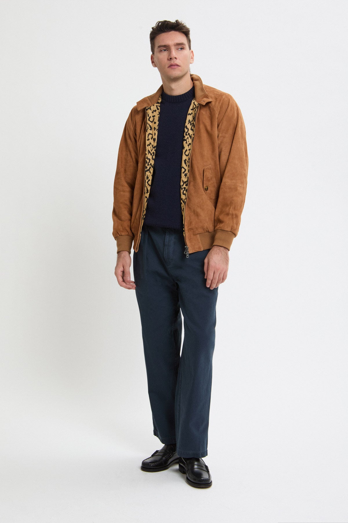 • The G9 Suede x Wacko Maria returns in a striking animalier edition, in three standout colourways: Black, Tobacco, and Chocolate. The outer layer is crafted from premium Baracuta suede, while inside the iconic leopard-print lining brings unmistakable Wacko Maria attitude, finished with a subtle metal chain loop detail. Both the design and fit have been updated, featuring a looser cut for a softer, unisex feel.