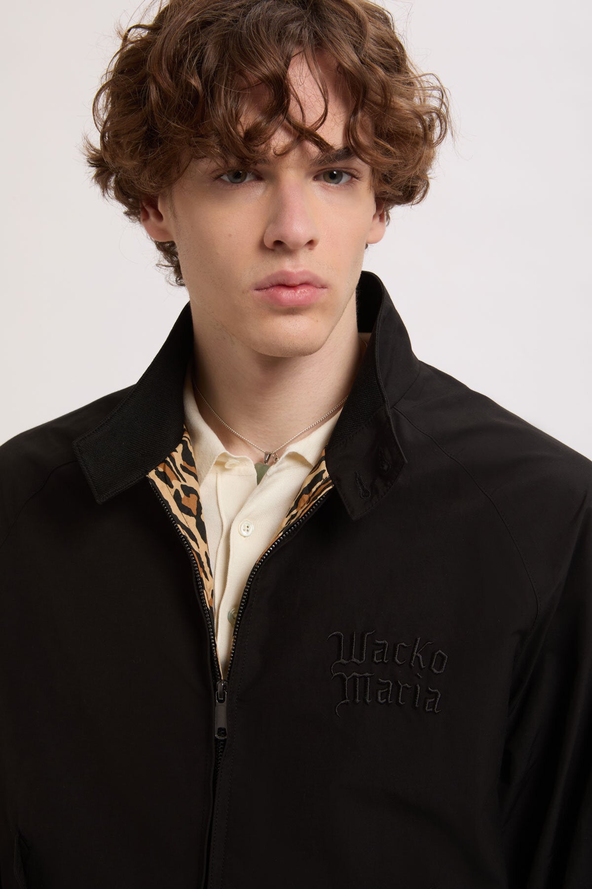 The jacket retains the signature G9 construction, including the umbrella back yoke, raglan sleeves and ribbed Dog Ear collar with double-button closure. The collaboration is marked by “Wacko Maria” embroidered on the chest, a metal hanging chain and a leopard-pattern lining that contrasts with the clean exterior. Available in Black and Andorra.